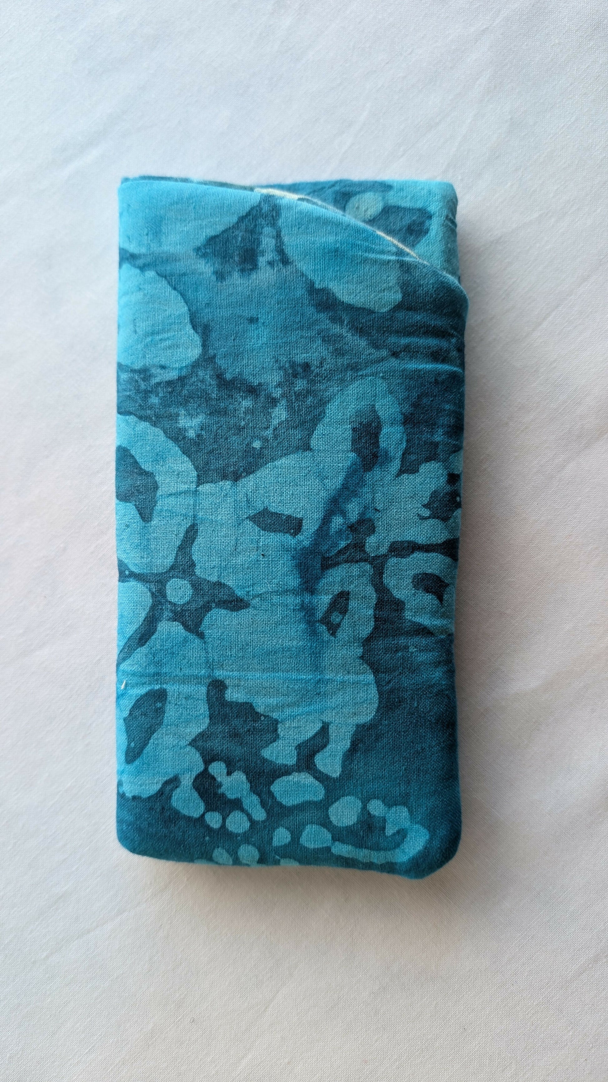 Padded glasses case made with cotton fabric. Approximately 6.5 inches long and 3 inches wide. Machine washable. Sold individually.