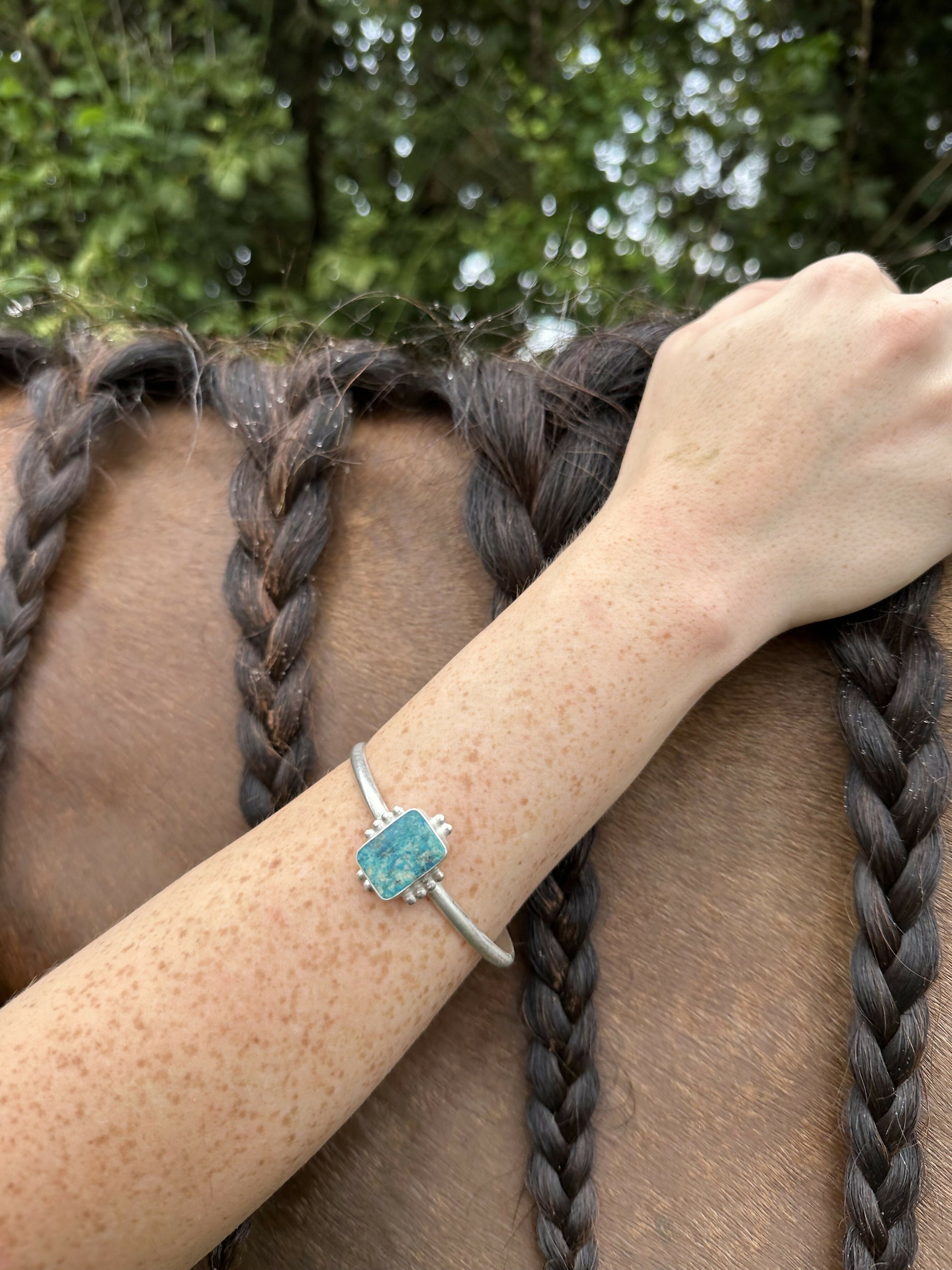 Sterling silver cuff bracelet, roughly 6 inches. A Kingman turquoise stone is the focus with sterling silver ball details. The bracelet is completely handmade.