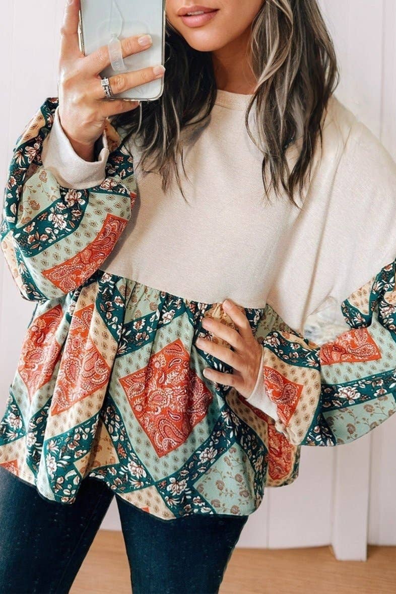 This women's top features a unique paisley geometric patchwork design. With a crew neck, bubble sleeves, and flowy fit, it pairs perfectly with leggings and casual pants. A must-have staple for any fall/winter wardrobe, it can be worn frequently.