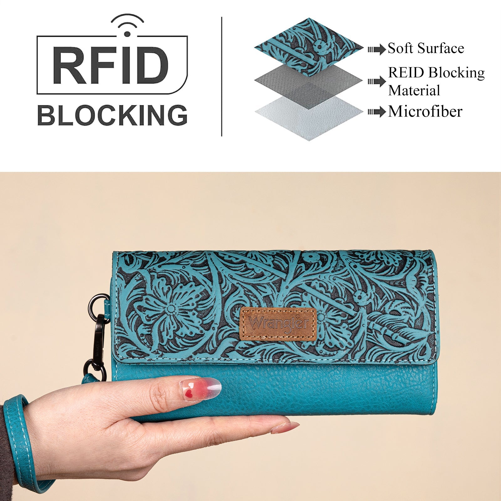 Wrangler Western Floral Tooled Tri-fold RFID Wallet/Wristlet